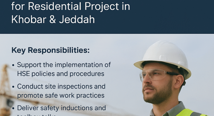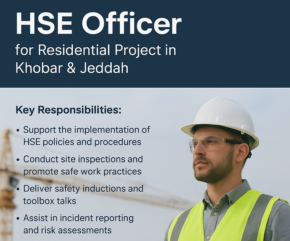 We are hiring HSE Officers for a residential project in Khobar and Jeddah. If you have experience in construction safety and hold valid certifications, this HSE Officer Jobs is your opportunity to work with a leading company.